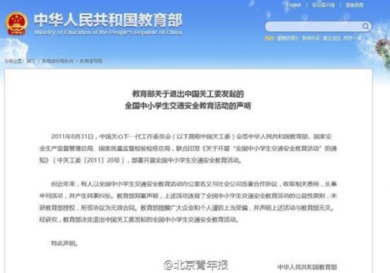 教育部近日發(fā)布聲明,決定退出中國關(guān)心下一代工作委員會發(fā)起的全國中小學(xué)生交通安全教育活動。昨天,質(zhì)檢總局官網(wǎng)聲明同樣宣布退出該活動。