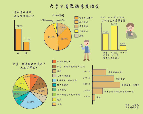 調(diào)查結(jié)果顯示,72.87%的受訪大學(xué)生對(duì)暑假作過(guò)規(guī)劃,45.15%的受訪者認(rèn)為規(guī)劃“執(zhí)行較差”,12.56%的受訪者表示“基本荒廢”。在暑假滿意度問(wèn)題上,36.22%的受訪大學(xué)生對(duì)自己的暑假生活表示“滿意”,52.73%的大學(xué)生認(rèn)為滿意程度與金錢無(wú)關(guān)。而對(duì)暑假生活“不滿意”的主要原因包括“自制力差,有惰性”“計(jì)劃落空”“沒(méi)有明確規(guī)劃”。