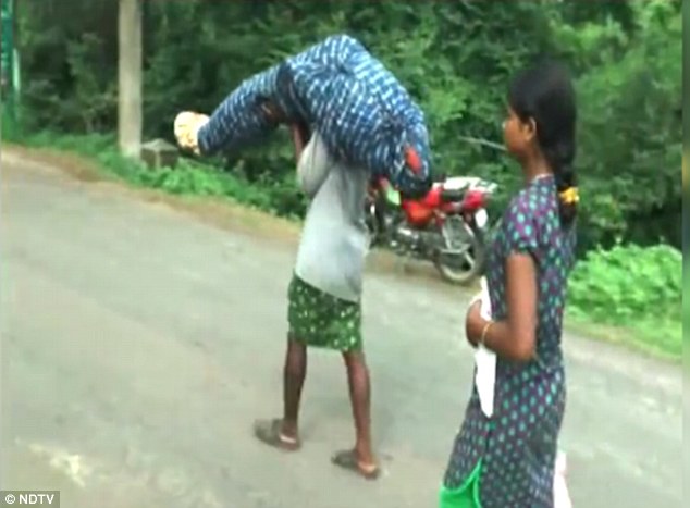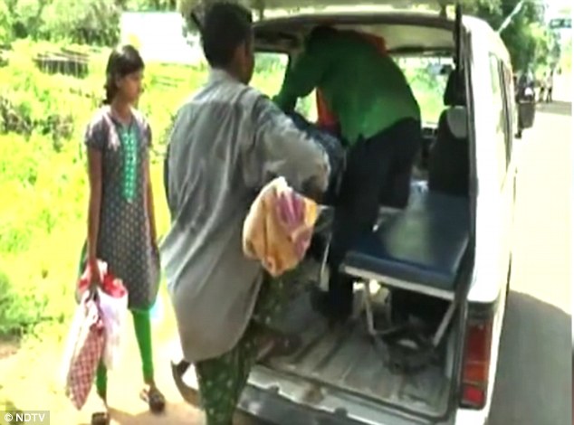 圖為志愿者叫來幫忙的車運走了Dana Majhi的妻子。
