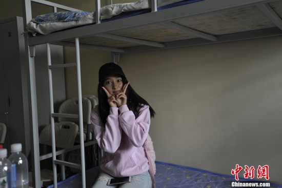 9月4日,“國民閨女”關曉彤身穿一襲粉色帽衫,現(xiàn)身北京電影學院報到,遭媒體圍堵。圖為關曉彤在寢室中。 中新網(wǎng)記者 李泊靜攝