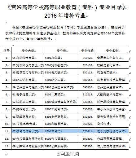 【教育部新增補(bǔ)專業(yè)13個(gè)電子競(jìng)技在列】近日,教育部發(fā)布《普通高等學(xué)校高等職業(yè)教育(專科)專業(yè)目錄》2016年增補(bǔ)專業(yè),公布了13個(gè)新增專業(yè),其中包括“電子競(jìng)技運(yùn)動(dòng)與管理”,屬體育類。新增專業(yè)適用于高等職業(yè)學(xué)校,將于2017年實(shí)行。
