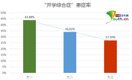 圖為從大一至大三“開學(xué)綜合癥”患癥率柱狀圖。中國青年網(wǎng)記者 王龍龍 制圖