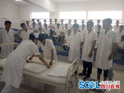 昨(29)日,記者來到四川中醫(yī)藥高等專科學(xué)校實驗室看到,教室里滿滿的男生,在老師的指導(dǎo)下,他們正在學(xué)習(xí)最基礎(chǔ)的課程——準(zhǔn)備用物,小小的病床就成了他們的主戰(zhàn)場。
