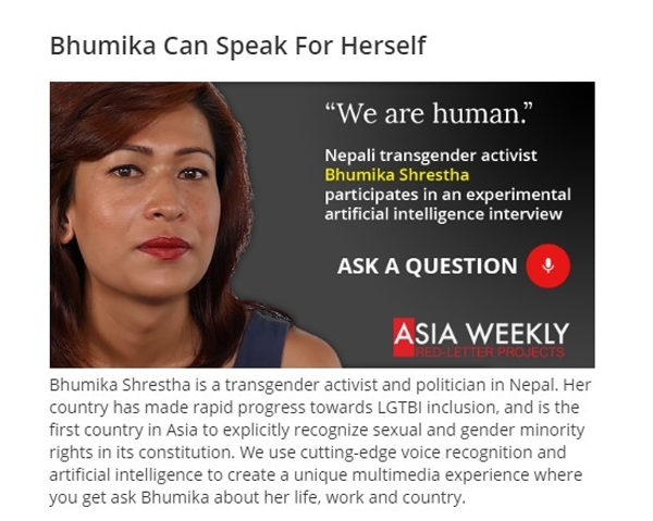 這次視像新聞主角是尼泊爾的一位名叫布米卡的變性者,一個在南亞備受爭議的新聞人物。尼泊爾的“第三性”運動使該國成為亞洲地區(qū)第一個承認變性人士合法權(quán)益的國家,該國的護照相應(yīng)出現(xiàn)了“第三性”性別的選項。布米卡是該國第一位以“第三性”性別身份護照出國的變性人士。