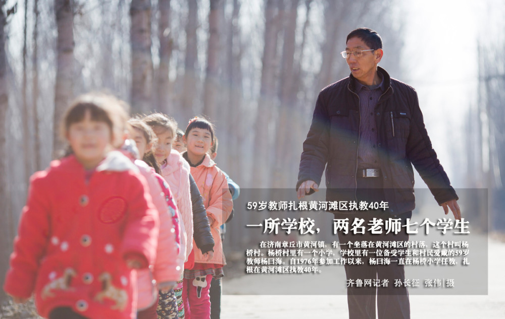 在濟(jì)南章丘市黃河鎮(zhèn),距離黃河不足1公里的灘區(qū)上,有一所只有兩名老師和七個學(xué)生的楊橋小學(xué)。近年來,隨著越來越多的村民外出打工,除了村里的留守兒童,學(xué)校里的學(xué)生越來越少。老師楊曰海今年已經(jīng)59歲了,自1976年參加工作以來,他便一直在這所小學(xué)任教,一干就是40年。另一位老師名叫邢兆蘭,她是楊曰海的學(xué)生,也是他的同事。1991年來到楊橋小學(xué)后,“師徒”兩人便扎根在這里教書育人,邢兆蘭也已經(jīng)在這里教了25年。齊魯網(wǎng)記者 孫長征 張偉|攝