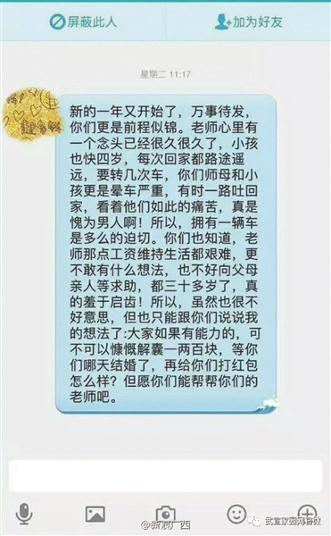 爆料帖中同時(shí)上傳了多張聊天記錄,其中一張顯示:“新的一年又開始了,萬事待發(fā),你們更是前程似錦。老師心里有個(gè)念頭已經(jīng)很久了,小孩也快四歲了,每次回家都路途遙遠(yuǎn),要轉(zhuǎn)幾次車,你們師母和小孩更是暈車嚴(yán)重,有時(shí)一路吐回家,看看他們?nèi)绱送纯,真是愧為男人啊!所以,擁有一輛車是多么的迫切。你們也知道老師那些工資維持生活都很艱難,更不敢有什么想法,也不好向父母親人求助,都三十多歲了,真的羞于啟齒!所以,雖然也很不好意思,但是也只能跟你們說說我的想法了:大家如果有能力的,可不可以慷慨解囊一兩百塊,等你們哪天結(jié)婚了,再給你們打紅包怎么樣?但愿你們能幫幫你們的老師吧!