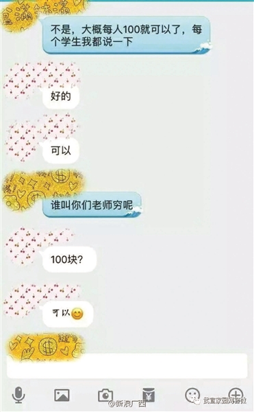 在被曝光的聊天記錄中,該老師曾表示,“大概每人100就可以了,每個(gè)學(xué)生我都說一下!辈⒔忉屨f,“誰叫你們老師窮呢?”聊天記錄顯示,群內(nèi)多名學(xué)生回復(fù)稱,“可以!