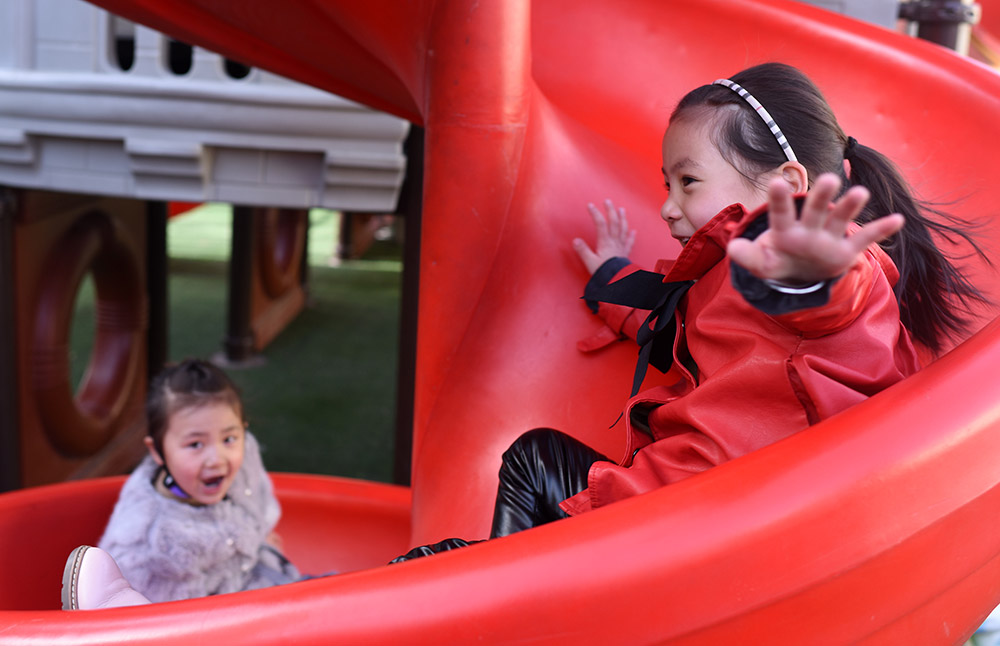 3月22日,青海省黃南藏族自治州幼兒園大班學生白瑪蘭澤(右)與伙伴一起乘坐滑梯。 從2016年春季學期開始,青海省在海北、海南、黃南、果洛、玉樹五個藏族自治州及海西蒙古族藏族自治州實行包括學前三年、義務教育九年、高中及中職三年的15年免費教育,西寧市、海東市的貧困家庭學生也享受上述政策,首批惠及學生86.1萬名。 “十三五”期間,青海省還將以擴大教育資源、促進教育公平為重點,加快廣大牧區(qū)雙語幼兒園建設,同時進一步優(yōu)化中小學布局結(jié)構(gòu)。新華社記者 張宏祥 攝 -