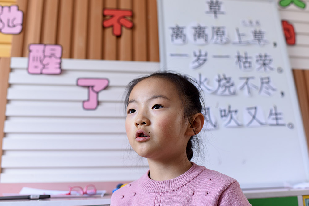 3月22日,青海省黃南藏族自治州幼兒園大班學生王雨馨在背誦古詩。 從2016年春季學期開始,青海省在海北、海南、黃南、果洛、玉樹五個藏族自治州及海西蒙古族藏族自治州實行包括學前三年、義務教育九年、高中及中職三年的15年免費教育,西寧市、海東市的貧困家庭學生也享受上述政策,首批惠及學生86.1萬名。 “十三五”期間,青海省還將以擴大教育資源、促進教育公平為重點,加快廣大牧區(qū)雙語幼兒園建設,同時進一步優(yōu)化中小學布局結(jié)構(gòu)。新華社記者 張宏祥 攝 -