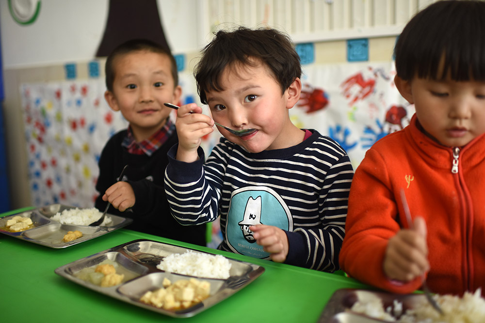 3月22日,青海省黃南藏族自治州幼兒園小班學生多杰卓瑪(中)在吃午餐。 從2016年春季學期開始,青海省在海北、海南、黃南、果洛、玉樹五個藏族自治州及海西蒙古族藏族自治州實行包括學前三年、義務教育九年、高中及中職三年的15年免費教育,西寧市、海東市的貧困家庭學生也享受上述政策,首批惠及學生86.1萬名。 “十三五”期間,青海省還將以擴大教育資源、促進教育公平為重點,加快廣大牧區(qū)雙語幼兒園建設,同時進一步優(yōu)化中小學布局結(jié)構(gòu)。新華社記者 張宏祥 攝 -