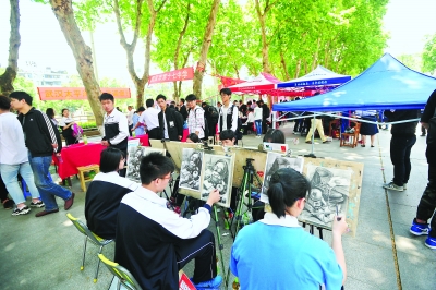 昨日在市十一中的中招咨詢會上,有的學校安排學生現(xiàn)場作畫展示教學水平 記者彭年 攝