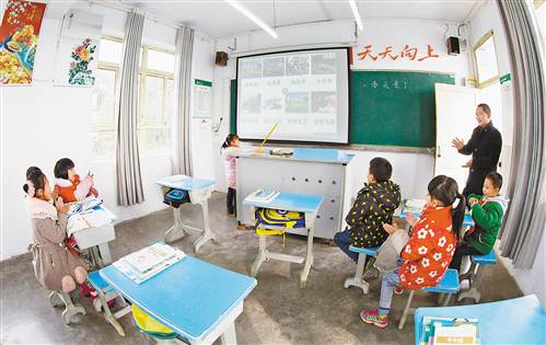 南川區(qū)福壽鎮(zhèn)教學(xué)點(diǎn)雖然只有7個(gè)一年級(jí)學(xué)生,但多功能教學(xué)室、圖書室、食堂一樣也不少。圖為老師曾令柯給孩子們上課。 特約攝影 瞿明斌 (本報(bào)資料圖片)