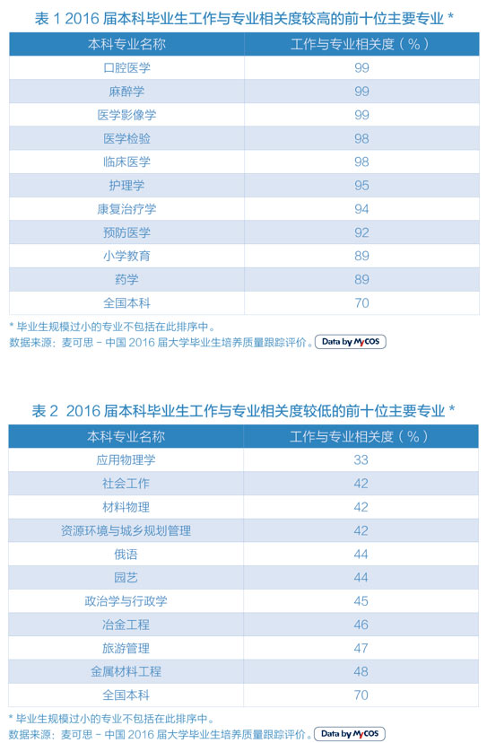 高考結(jié)束后,志愿填報(bào)成了家長(zhǎng)和考生面臨的另一道難題。麥可思近日發(fā)布《2017年中國(guó)大學(xué)生就業(yè)報(bào)告》(就業(yè)藍(lán)皮書(shū)),報(bào)告指出,三成以上畢業(yè)生工作與所學(xué)專業(yè)不對(duì)口;醫(yī)學(xué)類(lèi)專業(yè)工作與專業(yè)相關(guān)度高;應(yīng)用物理學(xué)工作與專業(yè)相關(guān)度較低;“與職業(yè)期待不符”、“迫于就業(yè)壓力”是選擇不對(duì)口工作的主要原因。