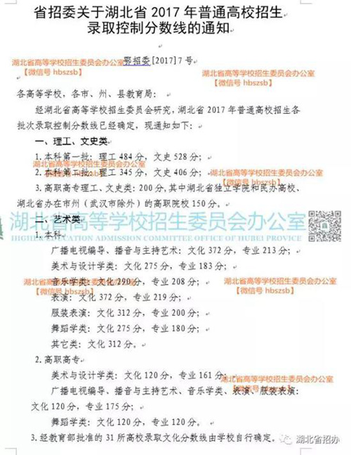 2017年湖北省高考各批次分?jǐn)?shù)線(xiàn)公布,具體如下: