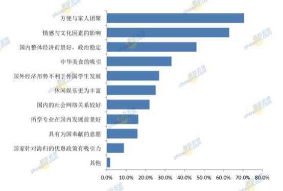 回國發(fā)展原因調查顯示,“方便與家人團聚”和“情感與文化因素的影響”是兩大主因,分別占比70.6%和63%。這與調查樣本中70.8%的海歸是獨生子女這一事實不無關系。國內經濟增長,政治穩(wěn)定;飲食文化、國外經濟形勢不利于外國學生發(fā)展、國內休閑娛樂更為豐富等方面因素比例均超過25%。另外,國內社會網絡關系、所學專業(yè)在國內發(fā)展前景、奉獻精神等亦是重要原因,分別占22%、16.2%、15.8%。因國家相關優(yōu)惠政策而歸國的人員僅占8.8%。