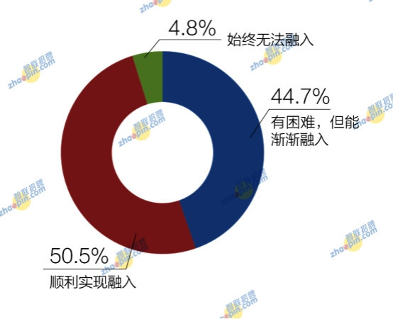 海歸回國之后,50.5%的海歸能順利融入國內生活與工作,認為雖有困難,但能逐漸克服占比44.7%。此外,4.8%的海歸表示回國后始終無法完全融入。與2015年的調查結果(一直很難融入的占12.9%)相比,海歸融入國內環(huán)境的情況明顯好轉。
