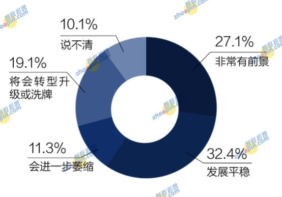 在對目前單位所在行業(yè)未來十年發(fā)展前景的看法上,海歸群體整理持樂觀態(tài)度,認為非常有前景的占27.1%,發(fā)展平穩(wěn)的占32.4%,將會轉型升級或洗牌的占19.1%,認為會進一步萎縮的占11.3%,另有10.1%認為說不清。