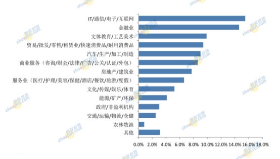 在就職行業(yè)方面,位居前五名的依次為IT/通信/電子/互聯(lián)網、金融業(yè)、文體教育/工藝美術、貿易/批發(fā)/零售/租賃業(yè)/快速消費品/耐用消費品、汽車/生產/加工/制造,占比分別為15.5%、14.6%、9.9%、9.4%、9%。此外,能源/礦產/環(huán)保、政府/非盈利機構、交通/運輸/物流/倉儲、農林牧漁四個行業(yè),占比均在5%以下。