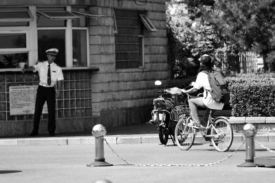 昨天中午12時許,記者推著一輛摩拜單車來到北京理工大學中關村校區(qū)東門,保安攔下,“這車不讓進!”
