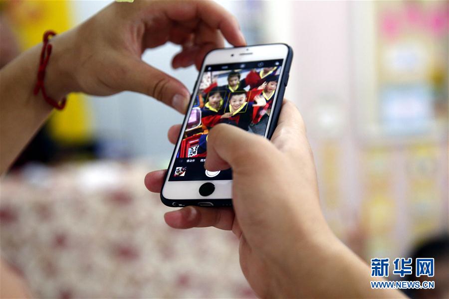 張鳴川用手機(jī)拍攝穿著畢業(yè)服的孩子們(6月30日攝)。新華社記者 張玉薇 攝 -