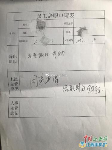 9月21日,記者聯(lián)系上該位博主,博主稱,公司是做電商的,這封辭職信是個1998年出生的女生寫的,她在公司做客服,是江西人!八芪撵o很漂亮,有1米70,很高!甭秾毟嬖V中國江西網(wǎng)記者。