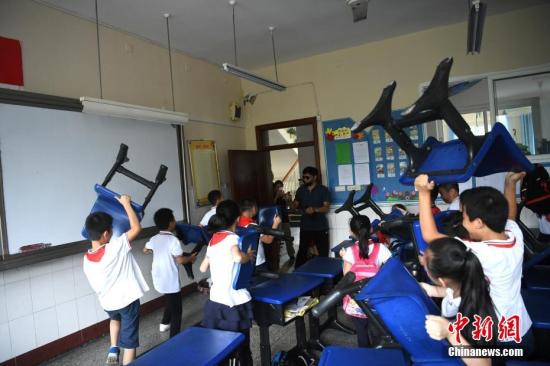 資料圖:9月25日,重慶南岸區(qū)天臺(tái)崗小學(xué)花園校區(qū)內(nèi)舉行反恐防暴演練。圖為小學(xué)生們正在練習(xí)如何用身邊工具來保護(hù)自己。中新社記者 陳超 攝