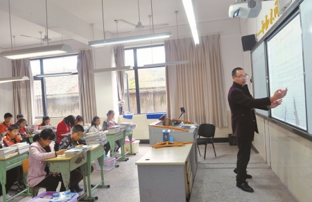 吳松老師在給初三的孩子們上化學課。