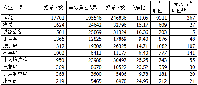 國稅是招錄大戶,目前共有19萬人通過審核,共有24萬人報(bào)名,競爭比為11:1,仍有367個(gè)職位無人報(bào)考。鐵路公安審核通過人數(shù)位居第二,目前有2.5萬人通過審核,競爭比為16:1。值得關(guān)注的是,國家物資儲(chǔ)備局雖然招錄人數(shù)不是很高,僅有51人,但目前有4236人報(bào)名,3554人通過審核,競爭比高達(dá)70:1。