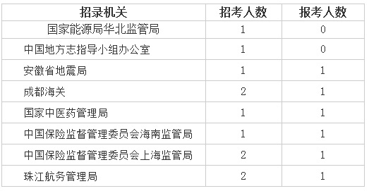 目前,國(guó)家能源局華北監(jiān)管局、中國(guó)地方志指導(dǎo)小組辦公室兩個(gè)部門仍處于虛位以待的狀態(tài),符合條件的考生可以重點(diǎn)考慮,以下幾個(gè)部門報(bào)考都相對(duì)“冷清”,考生們可在職位表里查看相關(guān)條件信息,看是否能夠報(bào)名。