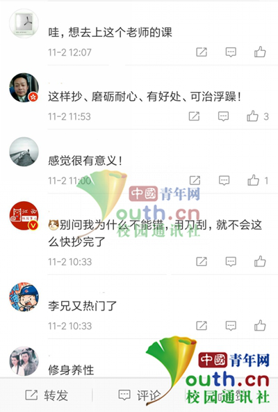 此事一經(jīng)自媒體傳播迅速,在網(wǎng)絡(luò)引發(fā)熱議。很多網(wǎng)友紛紛為此點(diǎn)贊打call。網(wǎng)友“@陳東東”評(píng)論:“超喜歡!”網(wǎng)友“@松”評(píng)論:“這樣抄,磨礪耐心,有好處,克制浮躁!本W(wǎng)友“@智障少女”更是直接表示:“哇,想去上這位老師的課!”