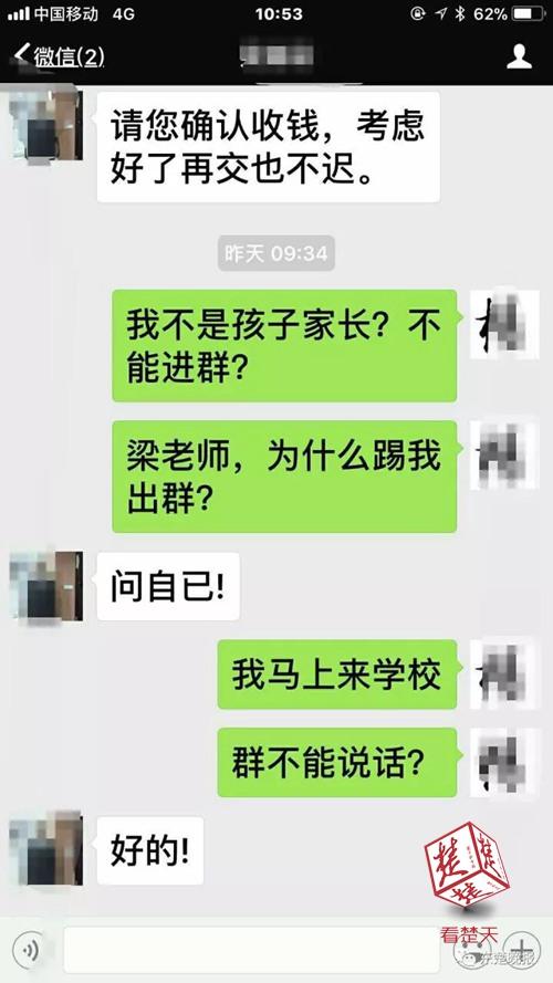 13日上午9時(shí)許,楊先生發(fā)現(xiàn)自己被班主任梁老師踢出了群。他私信問梁老師為什么,得到的回復(fù)是:“問自己!” 楊先生很氣憤,當(dāng)天到學(xué)校找領(lǐng)導(dǎo)反映此事,并全程用手機(jī)拍下了視頻。