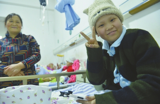 11月21日,醫(yī)院病房,13歲的女孩蒙欣笑對(duì)病魔。
