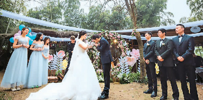 胡喆(右四)和唐瑾(右五)在自家民宿前舉辦婚禮,他們仿佛置身世外桃源,將自己的生活與民宿經(jīng)營(yíng)很好地結(jié)合在一起。