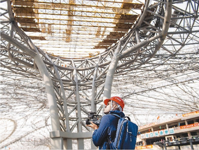 10月16日,南蘇丹廣播集團(tuán)記者阿湯加在北京新機(jī)場建設(shè)工地采訪拍攝,感受“中國速度”。新華社記者 劉金海攝