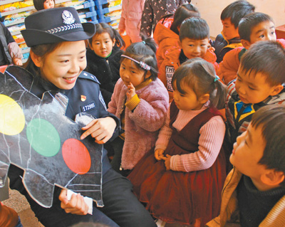 圖為1月15日,派出所民警在下浦幼兒園教小朋友認(rèn)識(shí)“紅綠燈”。