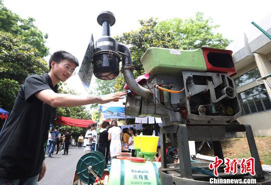 大學(xué)生被展出的農(nóng)耕機(jī)械吸引。 泱波 攝