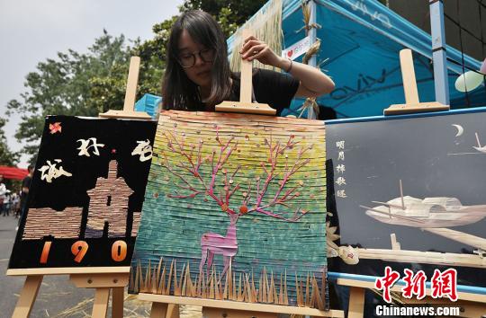 大學(xué)生展示以植物為材料制成的作品。 泱波 攝