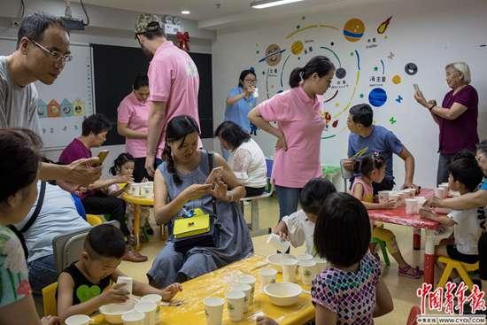 5月26日,周六,北京市海淀區(qū)綺美大廈,一家幼小銜接教育機(jī)構(gòu)的活動室內(nèi),孩子和家長在老師的指導(dǎo)下制作蛋糕杯。據(jù)介紹,這座大廈里扎堆兒著30余家教育培訓(xùn)機(jī)構(gòu),每周有五六千名孩子來上課。