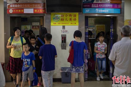 周末,孩子們背著印有培訓(xùn)機(jī)構(gòu)Logo的背包,里面放著白色的跆拳道服或粉紫色的舞蹈裙;或者一手拎著裝有奧數(shù)卷子、英文教材的布袋,一手被步履匆匆的爸媽拉著,從已經(jīng)停滿汽車看似無處下腳的路口現(xiàn)身,涌入綺美大廈的兩臺電梯,2到6層的電梯按鈕被全部按亮。