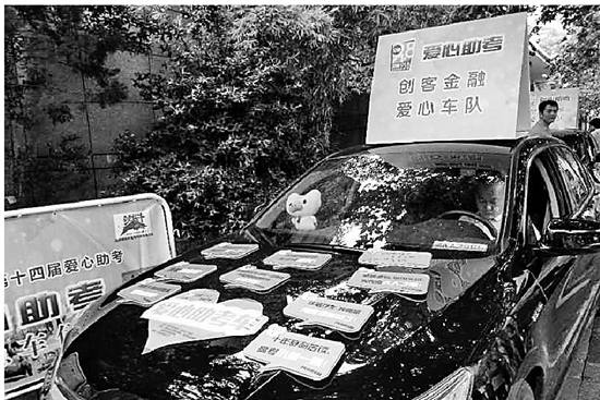 培訓機構往往是最早來到校門口駐扎的團體之一,除了送考車隊,他們還會免費奉獻上飲料、考試用筆、小扇子……
