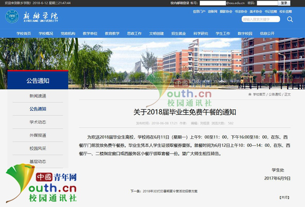 記者在該校官方網(wǎng)站看到,在公告通知一欄,該校學(xué)生處于6月9日發(fā)布了《關(guān)于2018屆畢業(yè)生免費午餐的通知》,通知內(nèi)容為:為歡送2018屆畢業(yè)生離校,學(xué)校將在6月11日(星期一)上午9:00至11:00,下午16:00至18:00,在東、西餐廳門前發(fā)放免費午餐券。畢業(yè)生憑本人學(xué)生證領(lǐng)取餐券壹張。就餐時間為6月12日上午10:00—14:00,在東、西餐廳一、二樓指定窗口或西服務(wù)區(qū)小餐廳領(lǐng)取套餐一份。望廣大師生相互轉(zhuǎn)告。