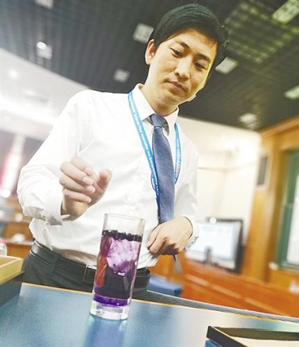 比賽現(xiàn)場,黃俊科拿出一個杯子,倒入礦泉水,放入幾粒黑枸杞,僅用了兩秒鐘,黑枸杞開始釋放出紫色,很快就把這杯水染成了漂亮的透明紫色。記者嘗了一下,還有一股淡淡的甜味。