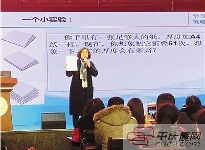 你手里有一張足夠大的紙,厚度如A4紙一樣,你能想象把它折疊51次,厚度會有多高嗎?昨日,中國心理學會會員、中科院心理所《學習策略研究》課題組成員朱淑玲來到渝中區(qū)中華路小學,與大家分享如何做一名智慧的學習型家長。