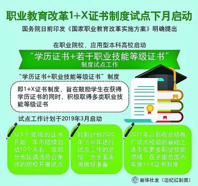 “職教20條”提出,從2019年開始,在職業(yè)院校、應(yīng)用型本科高校啟動“學(xué)歷證書+若干職業(yè)技能等級證書”制度試點(以下稱1+X證書制度試點)工作。試點工作要進一步發(fā)揮好學(xué)歷證書作用,夯實學(xué)生可持續(xù)發(fā)展基礎(chǔ),鼓勵職業(yè)院校學(xué)生在獲得學(xué)歷證書的同時,積極取得多類職業(yè)技能等級證書,提高就業(yè)創(chuàng)業(yè)本領(lǐng),緩解結(jié)構(gòu)性就業(yè)矛盾。