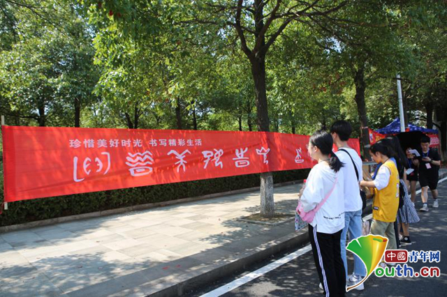 鄭文杰是該校教育學院美術(shù)教育專業(yè)大三學生,剛開學一進校門,他就被校門口“甲骨文橫幅”吸引住了。因為之前也沒有看到過類似的橫幅,所以他特意關(guān)注了一下。