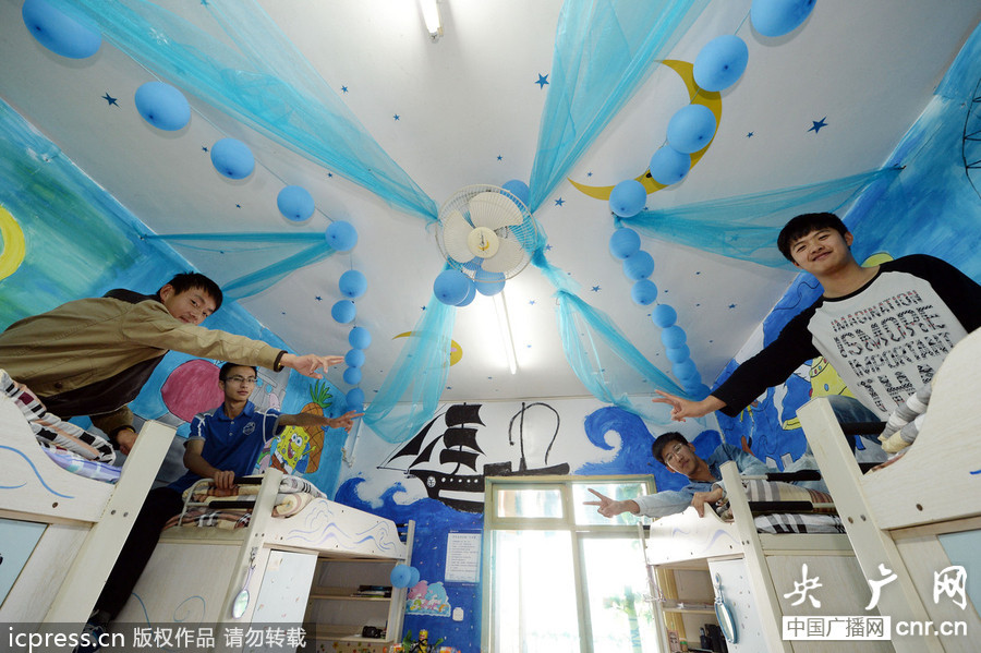 2013年10月26日,重慶西南大學(xué)學(xué)生會(huì)舉辦了一場(chǎng)新生宿舍美化大賽,數(shù)以千計(jì)的新生參與。許多創(chuàng)意獨(dú)特的95后,花了不到200元,就把寢室裝出了高端洋氣上檔次的格調(diào)?ㄍㄙu萌、奇幻漂流、文藝范兒……來看看他們的宿舍風(fēng)格與背后的故事吧?蓯劭ㄍ▔γ咳擞忻让奚幔航(jīng)濟(jì)管理學(xué)院工商管理專業(yè)大一男生宿舍竹園C棟316室花費(fèi):不超過100元,主要花費(fèi)在顏料紙張上畫著卡通小黃人的墻、維尼熊馬克杯、小螞蟻粉T恤……若不是墻角散落著的幾只略有味道的球鞋,你很難將眼前這間宿舍與男生聯(lián)系在一起。這間宿舍萌至如此,必須歸功一個(gè)人:宿舍的賣萌小王子詹鑫豪。自打入校的第一天起,發(fā)嗲、買各類賣萌產(chǎn)品……詹同學(xué)盡顯賣萌本色。在他的影響下,宿舍其他5個(gè)哥們也發(fā)現(xiàn)了自己的賣萌天分,集體賣萌成了宿舍的風(fēng)氣。比如:大家集體購(gòu)買了一系列風(fēng)格迥異的卡通睡衣,包括奶牛版、熊貓版等;再比如,大家有了一個(gè)個(gè)超萌的外號(hào):大狼、肥羊、猴子、毛毛、嚶。在寢室美化設(shè)計(jì)時(shí),詹鑫豪出力不少!拔覀冇(jì)劃在墻上畫點(diǎn)東西,但別的東西都好難畫,我突然想到近期看的動(dòng)畫片《卑鄙的我》里的小黃人,不是正好又萌又簡(jiǎn)單嗎?”全宿舍一致認(rèn)可這個(gè)提案,詹鑫豪更主動(dòng)承擔(dān)起為小黃人上色的任務(wù)。自稱“不擅賣萌”的周密同學(xué)表示,“相比很多同齡人,我們宿舍顯得比較幼稚。但用萌這種方式記錄生活,算是青春記憶吧。”紫紗式童話茶道來相伴宿舍:外國(guó)語(yǔ)學(xué)院免師英語(yǔ)專業(yè)大一7班女生宿舍桃園1棟201室花費(fèi):不超過200元,主要用于買卡通畫和紫紗擁有一個(gè)童話古堡,是萬千少女的夢(mèng)想,英語(yǔ)班的幾位同學(xué)把它變成了現(xiàn)實(shí)。最初,室長(zhǎng)吳倩一提議走公主風(fēng),立馬獲得壓倒性的支持。此后給宿舍起名字、設(shè)計(jì)細(xì)節(jié)等,遇到意見不一致時(shí),都是以少數(shù)服從多數(shù)為原則,“但有一點(diǎn):不能放馬后炮!备髯砸鹿裆系木S尼熊、米老鼠,搭在蚊帳上的層層紫色紗布,甚至在廁所門前專門貼了一張公主畫……公主風(fēng)鋪天蓋地而來。這間宿舍在全院打響名號(hào),除了夢(mèng)幻的布置,還離不開室友袁凡的宣傳。宿舍里兩套精致的茶幾頗引人注目,它們的主人、被同學(xué)們盛贊為“茶神”的妹子來自云南,家鄉(xiāng)盛產(chǎn)普洱茶,“我們家很多人是茶文化愛好者。我平時(shí)泡了茶,就會(huì)喊大家來喝,享受泡茶、品茶的過程。”時(shí)光軸愛上照片墻宿舍:經(jīng)濟(jì)管理學(xué)院農(nóng)業(yè)經(jīng)濟(jì)管理大一1班女生宿舍南苑9舍525室花費(fèi):不超過200元,錢主要用在購(gòu)買顏料、卡紙等上愛拍照、愛旅游、愛泡咖啡館……在王麗君看來,宿舍姐妹們雖然性格有靜有動(dòng),但或多或少都有顆文藝的心。這也很好地解釋了為什么舍長(zhǎng)宋錦雯一提議宿舍美化走文藝范,大家都舉雙手贊成。“不如和人人網(wǎng)一樣,我們也建一個(gè)實(shí)體版的時(shí)光軸”、“不如我們貼上黃色的墻紙,讓宿舍看起來像個(gè)咖啡館”……確立主題后,舍友們你一言我一語(yǔ)開始構(gòu)思細(xì)節(jié)。很快,時(shí)光軸火速出爐,事后它確實(shí)成為了宿舍的一大標(biāo)志。時(shí)光軸的主材料是涼席和各張打印出來的照片以及文字解說。時(shí)光軸上,記錄了大家相處的兩個(gè)多月美好時(shí)光。王麗君向記者介紹,“第一張是軍訓(xùn)開始前在宿舍的第一張合影,第二張是軍訓(xùn)拉練時(shí)我們疲憊狀態(tài)下的自拍,第三張是班級(jí)第一次聚餐,我們宿舍的坐在一起……”談起“時(shí)光軸”的未來,王麗君表示,“我們都是自拍狂,也特別喜歡記錄生活的點(diǎn)點(diǎn)滴滴,所以未來肯定會(huì)有更多精彩照片,我們還會(huì)分享出來,當(dāng)然那時(shí)我們可以選擺更美的照片。”