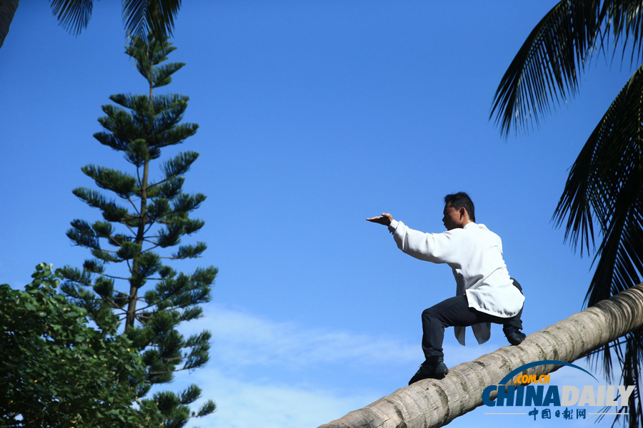 近日,在海南大學(xué)校園內(nèi)一名站在椰子樹上練功的“神人”在網(wǎng)上走紅。2013年10月30日,記者現(xiàn)場(chǎng)目睹這位“神人”的了得功。其進(jìn)行簡(jiǎn)短熱身后,快速“飛奔”上椰子樹,進(jìn)行單腳獨(dú)立或展臂雙飛動(dòng)作練武功,足有20多分鐘,其神情泰然自若,吸引了不少圍觀者。
