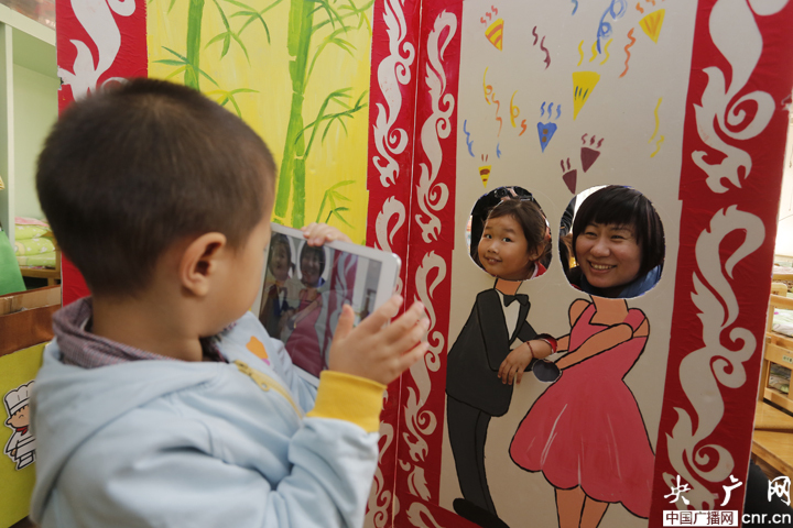 孔震英園長(zhǎng)與孩子們?cè)趨^(qū)域游戲互動(dòng)