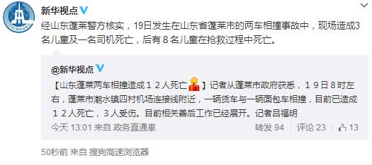 據(jù)新華視點(diǎn)微博消息,經(jīng)山東蓬萊警方核實(shí),19日發(fā)生在山東省蓬萊市的兩車相撞事故中,現(xiàn)場造成3名兒童及一名司機(jī)死亡,后有8名兒童在搶救過程中死亡。