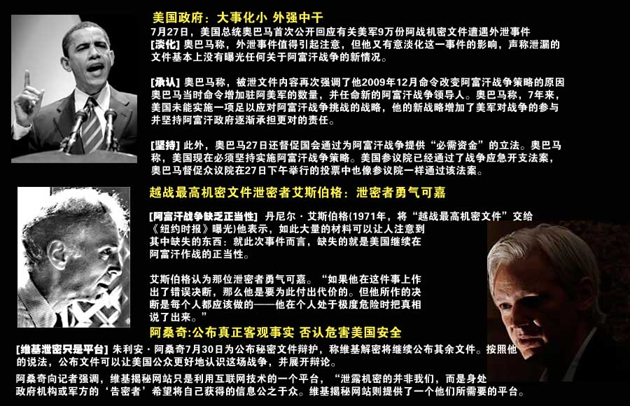 事發(fā):阿戰(zhàn)9萬份情報(bào)曝光 系美軍史上最大泄密案之一 一家名為“維基解密”的美國(guó)網(wǎng)站7月25日公布了91000多份涉及美國(guó)在阿富汗戰(zhàn)爭(zhēng)中的秘密文件,這些秘密文件主要包括大量的美軍和北約部隊(duì)的作戰(zhàn)內(nèi)容、行動(dòng)。